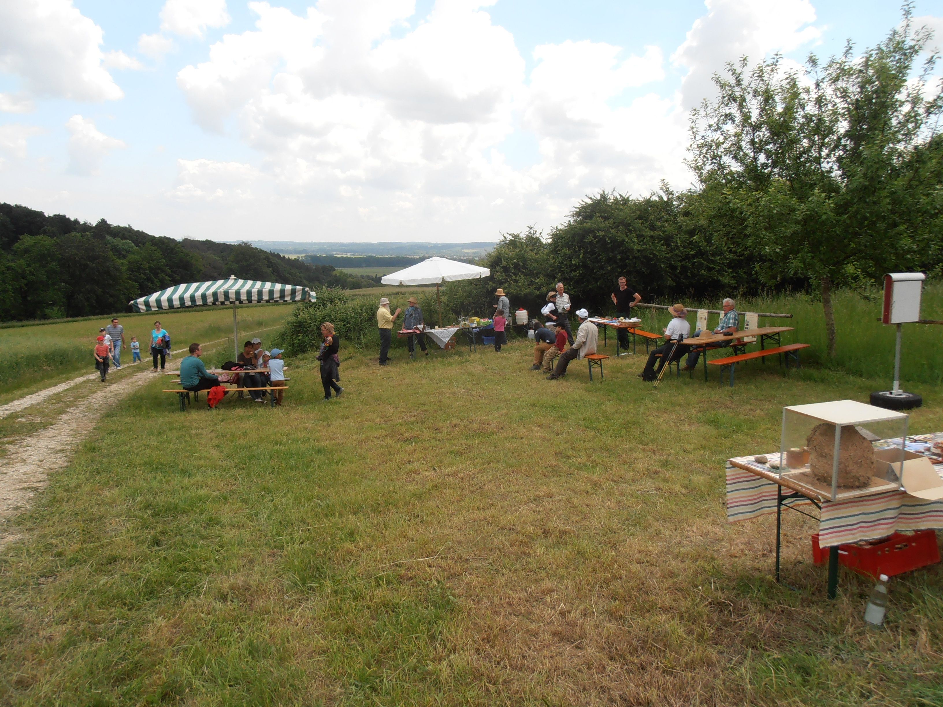 Den weiteren Weg mussten die Teilnehmer mit Hilfe von Ausschilderungen selbst finden. Am Kieselberg trafen sie dann auf die Wildbienenstation. Bernhard Pellkofer und Dennis Hörl informierten über die große Vielfalt an Wildbienen. Diese leben allein und legen ihre Brut in verschiedenen Materialien, oft in Totholz an. Viele Wildpflanzen sind auf die Bestäubung durch Wildbienen angewiesen. Zum Beispiel werden Zaunrüben ausschließlich von der Zaunrübenbiene bestäubt. Der Kieselberg kann als Musterbeispiel für eine bienenfreundliche Landschaft gelten: Magere schüttere Blühwiesen sind durchsetzt von offenen Sandstellen und feuchteren Mulden. Totholz bereichert die Flächen. Der Landschaftspflegeverband sorgt hier für einen biologisch hochwertigen Zustand der landkreiseigenen Flächen.