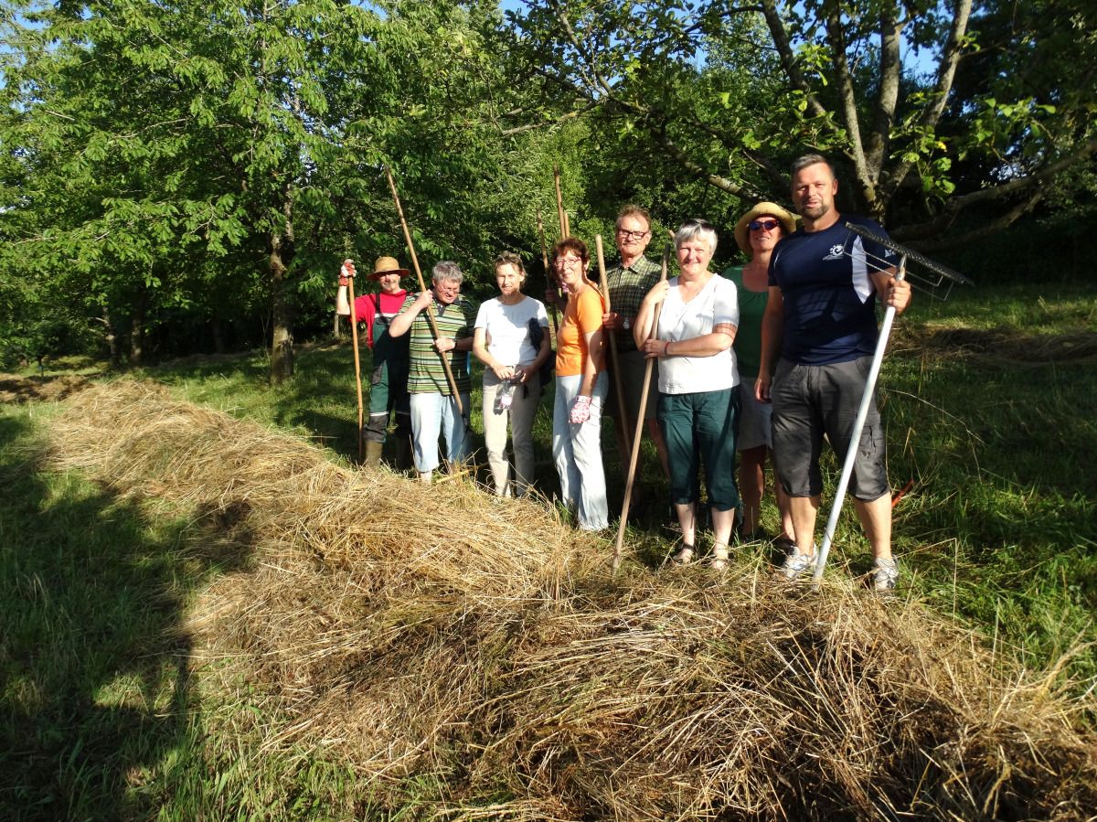 Mannshoch war das Gras heuer auf der Streuobstwiese des Bund Naturschutz am Zanklberg. Damit sich die Blumenwiese unter den Bäumen gut entwickeln kann und die Wühlmäuse von Eulen, Bussard und anderen Jägern besser erbeutet werden können, muss sie 2-mal im Jahr gemäht werden. Das Wetter war ideal, so dass Klaus Klobe diese Woche die 7000 qm große Obstwiese mit dem Balkenmäher mähen konnte. Am Dienstag war dann Arbeitsansatz für die Baumpächter angesagt. Das Heu musste auf Strangen zusammengerecht werden, damit es von Jakob Sigl aus Harburg mit dem Ladewagen abtransportiert werden kann. 10 Helfer waren zum vereinbarten Zeitpunkt mit ihren Rechen zur Stelle. Wie in früheren Zeiten wurde nach getaner Arbeit der Durst mit einem Schluck frischem Apfelmost gestillt. Schade ist, dass das Heu kompostiert werden muss, da man dafür zur Zeit keine richtige Verwendung hat. Es würde für nächstes Jahr jemand gesucht, der Interesse an dem frischen Gras oder Heu der Streuobstwiese hat. Das könnte ein Landwirt, Pferdezüchter, Kleintierzüchter, oder auch ein Tierheim sein. Pacht fällt keine an. Voraussetzung wäre allerdings, dass die Bäume bei der Arbeit geschont werden und keine Rinde verletzt oder Äste abgerissen werden. Interessenten sollen sich bei Franz Meindl Tel. 09951 601318