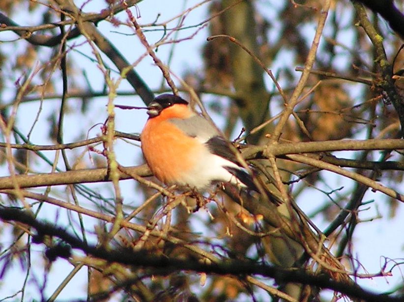 Der Dompfaff oder Gimpel ist einer unserer farbenprächtigsten Singvögel. Dompfaffe sind hauptsächlich im Winter bei uns zu beobachten. Während der Brutzeit im Sommer trifft man den Vogel in unserem Landkreis kaum an. Sein Brutgebiet sind die Hochlagen des Bayerischen Waldes. Da diese Gebiete aber im Winter meist völlig zugeschneit sind weichen die Gimpel wegen des besseren Nahrungsangebots in tiefere Lagen aus. Meist halten sich die Vögel in der Wipfelregion hohen Bäume auf. Es ist schon eine Besonderheit, wenn man den Dompfaff am Futterhäuschen beobachten kann.