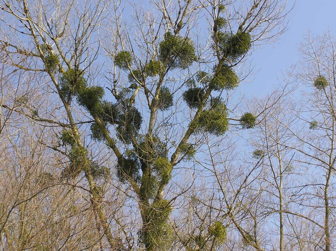 Die Mistel ist eine ungewöhnliche Pflanze. Sie benötigt einen Wirtsbaum mit weicher Rinde. Pappeln und Apfelbäume werden bevorzugt, während sie auf anderen Laubbäumen nur selten wächst. Misteln sind so genannte Halbparasiten. Sie dringen mit ihren Saugwurzeln zwar in das Holz des Wirtsbaumes ein und entziehen ihm auch Wasser und Mineralstoffe, ihre Wachstumsnahrung stellen sie aber mittels eigenem Blattgrüns selber her. Misteln bilden kugelförmige Büsche aus Stielen, die sich paarweise verzweigen. Die immergrüne Mistel hat keine Rinde und auch keine echte Wurzel und wächst auch nicht dem Licht entgegen oder nach der Schwerkraft. Sie bekommen bis zu 1 m Durchmesser und werden maximal 70 Jahre alt. Die Blütezeit ist vor dem Laubaustrieb im März und April . Die Blüte selbst ist zweihäusig, unscheinbar gelbgrün und maximal einen halben Zentimeter groß. Die Blüten enthalten Nektar welcher einen feinen Orangenduft verbreitet. Die weißen oder gelblich glänzenden , erbsengroßen Beeren gedeihen im November und Dezember und enthalten einen klebrigen Schleim mit einem Kern . Die für Menschen ungenießbare Frucht hat nach dem ersten Frost einen süßen Erdbeergeschmack. Um den Samen für die Fortpflanzung unter die Rinde zu bekommen bedient sie sich eines Tricks. Ihrem Hauptverbreiter der Misteldrossel bietet sie ein wohlschmeckendes Fruchtfleisch . Diese Nahrung ist jedoch äußerst zäh und schleimig und lässt sich auf Anhieb nicht gut fressen, ohne dass der innen steckende Samen am Schnabel kleben bleibt. Der Vogel muss sich eine Rindenritze suchen und sein Anhängsel darin abstreifen. Ist es der richtige Baum und passen Temperatur und Feuchtigkeit keimt der Samen und eine neue Mistelkugel kann entstehen. Die Mistel ist als Heilpflanze bekannt und wird als unterstützendes Mittel in der Krebstherapie, bei Bluthochdruck und zur Linderung von Arthrosen und Arteriosklerose verwendet. Dem kleinen Strauch werden Zauber und Heilkräfte nachgesagt. So sollen Mistelzweige über der Haustüre vor Donner, Blitz und Hexen schützen. Den keltischen Priestern war sie allheilende Medizin- und Kultpflanze zugleich. Als heidnisches Kraut darf sie noch heute keine Kirche in England schmücken. Eine englische Tradition aus dem Mittelalter ist auch bei uns in Deutschland bekannt geworden: Küssen unter dem Mistelzweig. Einst galt es als Heiratsversprechen, wenn ein junger Mann seine Angebetete in der Öffentlichkeit küsste. Nur unter einer Früchte tragenden Mistel durfte er es ohne Folgen tun, denn jeder Kuss kostete eine Beere vom Zweig. Wer eine eigene Pappel oder einen Apfelbaum besitzt kann versuchen, seinen eigenen Mistelstrauch an zu siedeln. Man zerdrückt dazu möglichst viele reife und frische Beeren und wickelt das schleimige Mus samt Samen mit einer Mullbinde um möglichst viele Äste des Baums. Mit etwas Glück wachsen dann nach ein bis 3 Jahren grüne Keimlinge. Nach weiteren 4 Jahren blüht die Mistel das Erste mal und man kann unter dem eigenen Mistelzweig Weihnachten verbringen.