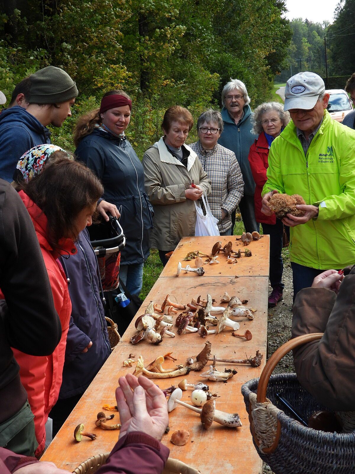 Einführend stellte Meindl die für das Pilze sammeln notwendige Ausrüstung vor: Ein Korb sei zweckmäßig. Plastiktüten seien nicht sinnvoll. Da Pilze Feuchtigkeit abgeben werden sie in Tüten matschig. Der Pilzsachverständige hatte auch einen Plastikbehälter dabei, so wie ihn Angler für ihre Ausrüstung schätzen. In dieser Box kann man empfindliche Arten schützen und auch Pilze zur Nachbestimmung transportieren. Unbestimmte Pilze sollte man nämlich nicht mit den sicher bestimmten essbaren Arten zusammen aufbewahren. Ein normales Taschenmesser reiche aus, aber Profis hätten oft ein Messer mit einer Bürste am Griff zur Reinigung der Pilze. Und dann sollte man immer ein gutes Bestimmungsbuch dabeihaben, so könne man vor Ort schon wichtige Arten erkennen. Zweckmäßig sollte auch die Kleidung sein. Gummistiefel und Hose über die Stiefel oder Socken über die Hose würden bei der Zeckenabwehr helfen, so der Fachmann.